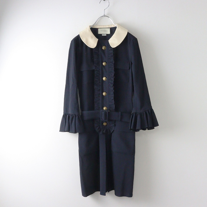 グッチ GUCCI シルク混ジョーゼット ベルト付き フリル袖 バイカラーワンピース