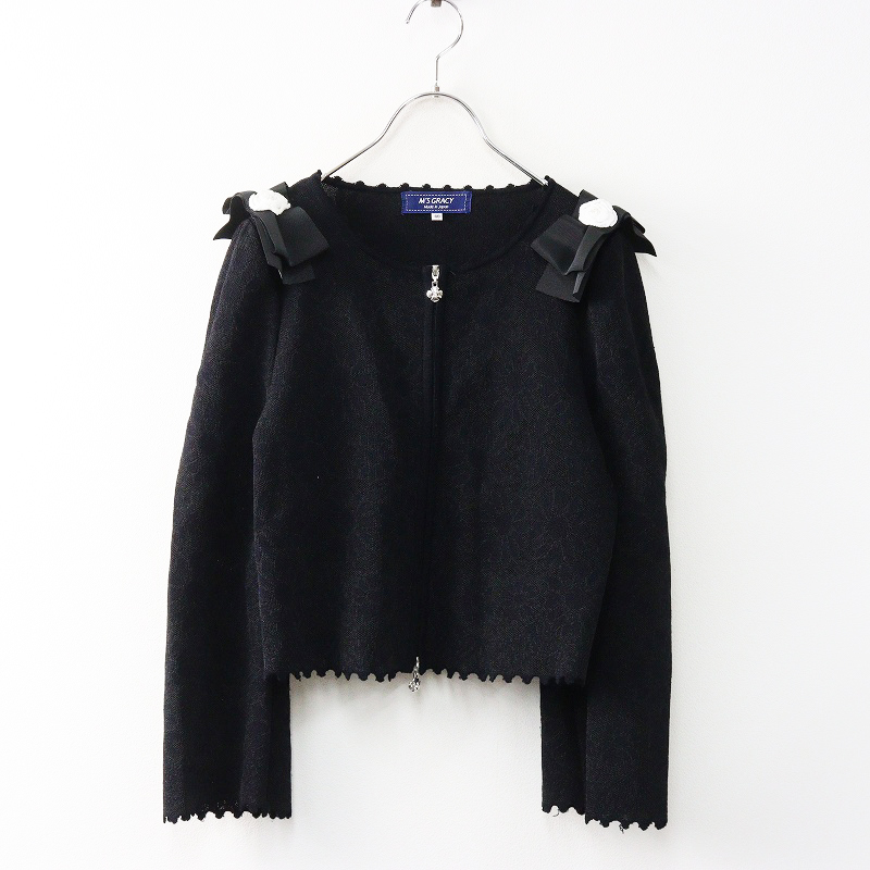 エムズグレイシー M’S GRACY 肩グログランリボン フラワージャガード ジップニットカーディガン