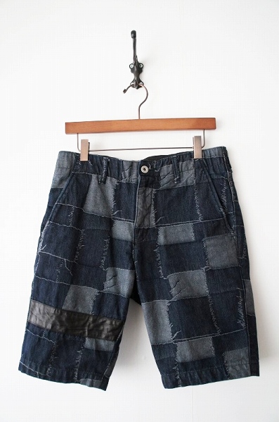 ISAMU KATAYAMA BACKLASH(イサムカタヤマバックラッシュ):パッチワークジャガードデニム+ホースレザー ハーフパンツ