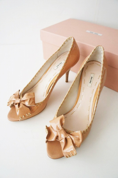 miumiu(ミュウミュウ):パテントレザー リボン オープントゥパンプス