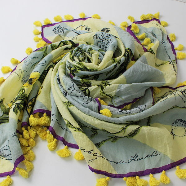 :manipuri マニプリ フラワーブック柄 ポンポン付 ストール