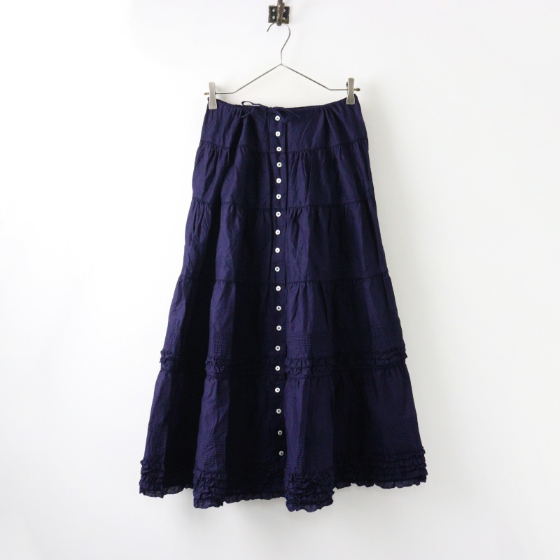 ピンクハウス PINK HOUSE 綿ローン 裾ピコフリル 前ボタン ティアードロングスカート ネイビー