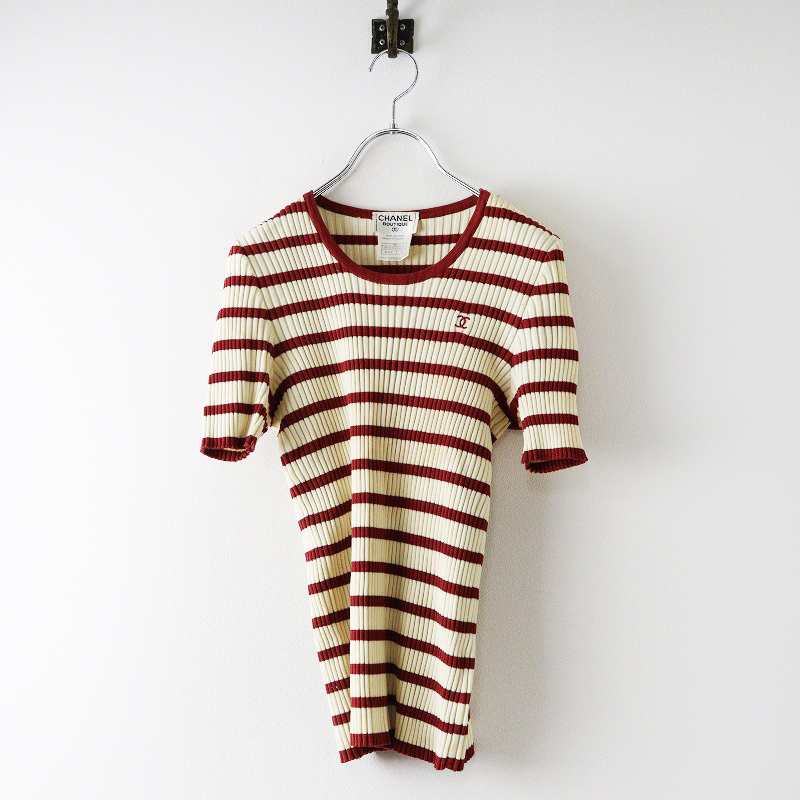 10,000円ヴィンテージ シャネル CHANEL 98P ココマーク刺繍入り 半袖ボーダーリブニット
