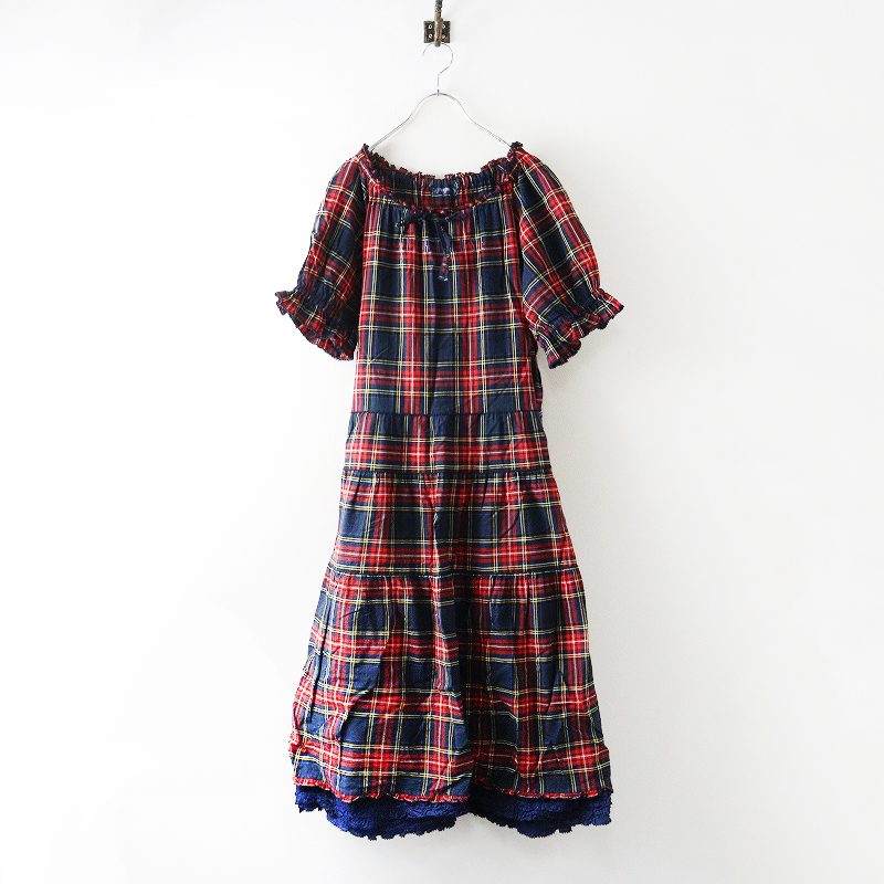 14,400円ピンクハウス PINK HOUSE ロゴ刺繡 裾ピコフリル コットンリネンタータンチェックワンピース